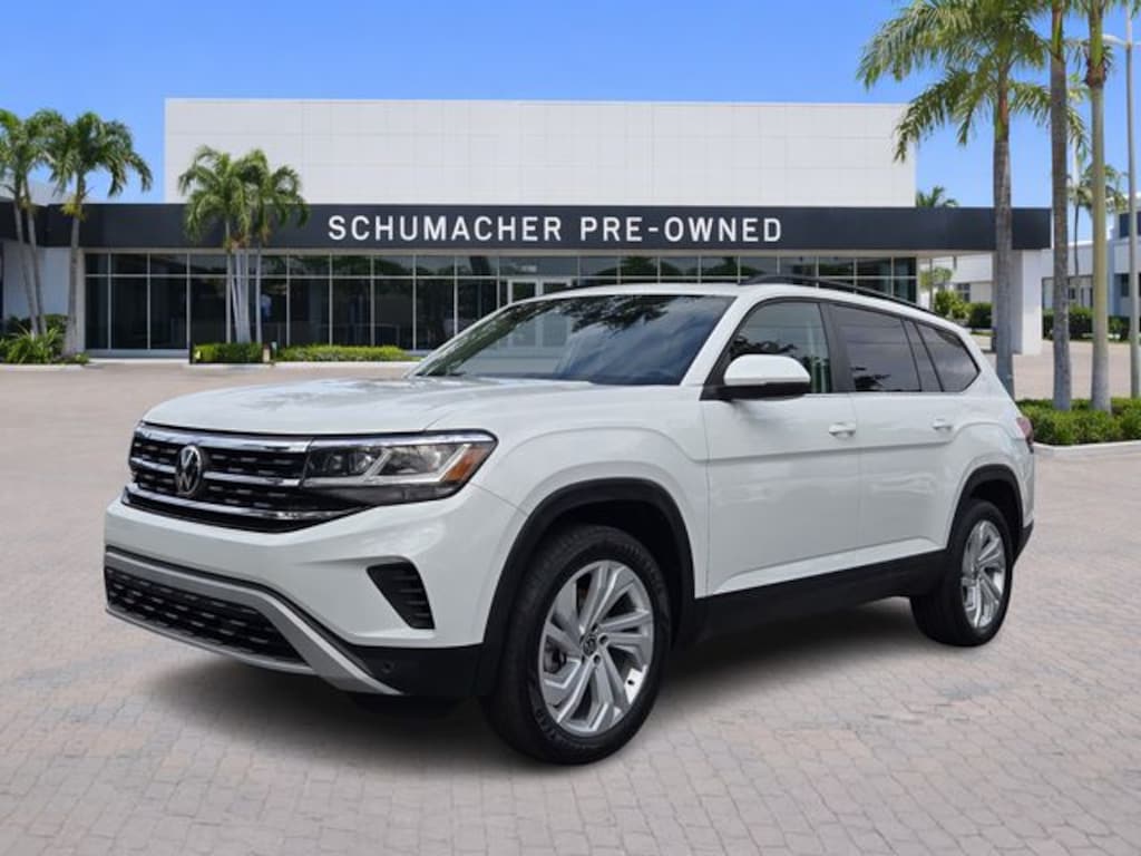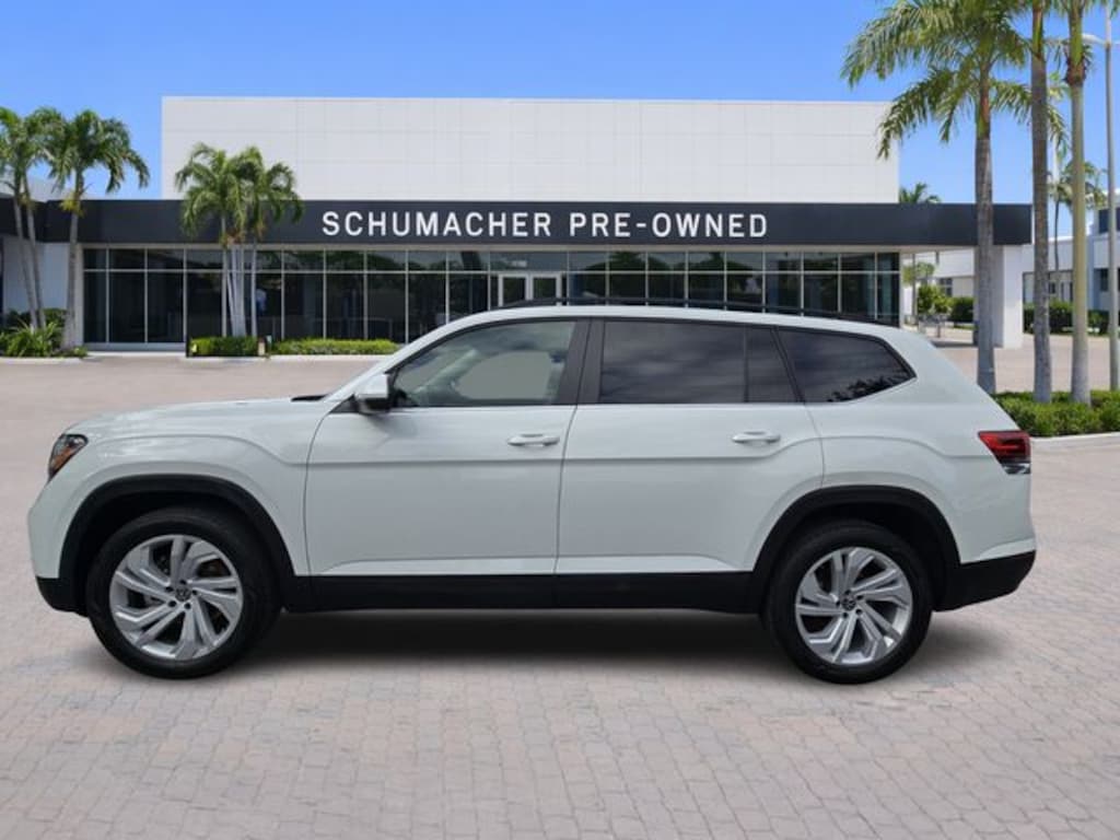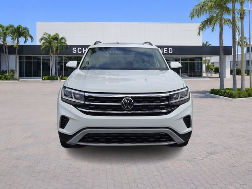 2023 Volkswagen Atlas 2.0T SE w/Technology Pure White CARFAX One-Owner. Certified. FWD 8-Speed Automatic with Tiptronic 2.0L TSI **VW CERTIFIED**, Atlas 2.0T SE w/Technology, 4D Sport Utility, 2.0L TSI, 8-Speed Automatic with Tiptronic, FWD, Pure White, Shetland Beige Premium Synthetic, 3.60 Axle Ratio, 3rd row seats: split-bench, 4-Wheel Disc Brakes, 6 Speakers, ABS brakes, Air Conditioning, Alloy wheels, AM/FM radio: SiriusXM with 360L, Auto-Dimming Rear-View Mirror, Auto-dimming Rear-View mirror, Automatic temperature control, Brake assist, Bumpers: body-color, Carpeted Mats - Bench Seats, Carpeted Mats Kit - Bench Seat, Compass, Delay-off headlights, Driver door bin, Driver vanity mirror, Dual front impact airbags, Dual front side impact airbags, Electronic Stability Control, Emergency communication system: VW Car-Net Safe & Secure 5-year, Exterior Parking Camera Rear, First Aid Kit, Four wheel independent suspension, Front anti-roll bar, Front Bucket Seats, Front Center Armrest, Front dual zone A/C, Front fog lights, Front reading lights, Fully automatic headlights, Heated Comfort Front Bucket Seats, Heated door mirrors, Heated front seats, Heavy Duty Trunk Liner w/VW CarGo Blocks, Illuminated entry, Leather Shift Knob, Low tire pressure warning, Occupant sensing airbag, Outside temperature display, Overhead airbag, Overhead console, Panic alarm, Panoramic Sunroof Package, Passenger door bin, Passenger vanity mirror, Perforated V-Tex Leatherette Seating Surfaces, Power door mirrors, Power driver seat, Power Liftgate, Power steering, Power Tilting & Sliding Panoramic Sunroof, Power windows, Privacy Cover, Radio data system, Radio: MIB3 Composition Media w/8" Touchscreen, Rain sensing wipers, Rear air conditioning, Rear anti-roll bar, Rear reading lights, Rear seat center armrest, Rear window defroster, Rear window wiper, Remote keyless entry, Roadside Assistance Kit, Security system, Speed control, Speed-sensing steering, Split folding rear seat, Spoiler, Standard Suspension, Steering wheel mounted audio controls, Tachometer, Telescoping steering wheel, Tilt steering wheel, Traction control, Trip computer, Turn signal indicator mirrors, Variably intermittent wipers, VW Car-Net Safe & Secure 5-Year Plan, Wheels: 20" x 8J 5-Spoke Silver Painted Alloy.