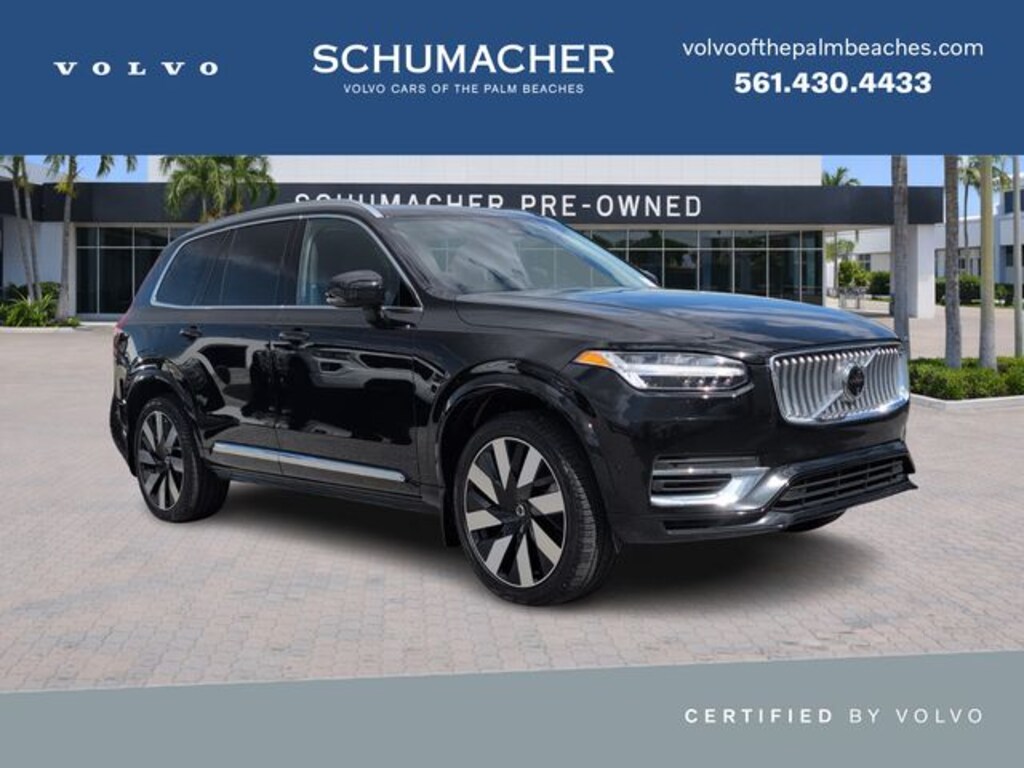 2025 Volvo XC90 Plug-In Hybrid T8 Plus 6 Passenger Onyx Black Metallic CARFAX One-Owner. Clean CARFAX. Certified. AWD Automatic with Geartronic 2.0L I4 Hybrid Turbocharged DOHC 16V LEV3-SULEV30 XC90 Plug-In Hybrid T8 Plus 6 Passenger, 4D Sport Utility, 2.0L I4 Hybrid Turbocharged DOHC 16V LEV3-SULEV30, Automatic with Geartronic, AWD, Onyx Black Metallic, Charcoal w/Leather Upholstery, 11 Speakers, 3rd row seats: bucket, 4-Wheel Disc Brakes, ABS brakes, Air Conditioning, Alloy wheels, AM/FM radio: SiriusXM, Anti-whiplash front head restraints, Apple CarPlay, Auto High-beam Headlights, Auto-dimming door mirrors, Auto-dimming Rear-View mirror, Automatic temperature control, Brake assist, Bumpers: body-color, Delay-off headlights, Driver door bin, Driver vanity mirror, Dual front impact airbags, Dual front side impact airbags, Electronic Stability Control, Emergency communication system: Volvo Cars App w/4 Year Subscription, Exterior Parking Camera Rear, Four wheel independent suspension, Front anti-roll bar, Front Bucket Seats, Front Center Armrest w/Storage, Front dual zone A/C, Front reading lights, Fully automatic headlights, Garage door transmitter: HomeLink, Genuine wood dashboard insert, Genuine wood door panel insert, Headlight cleaning, Heated door mirrors, Heated Front Bucket Seats, Heated front seats, Heated rear seats, Heated steering wheel, Illuminated entry, Integrated rear child seats, Knee airbag, Leather Upholstery, Low tire pressure warning, Memory seat, Navigation System, Occupant sensing airbag, Outside temperature display, Overhead airbag, Panic alarm, Passenger door bin, Passenger vanity mirror, Power door mirrors, Power driver seat, Power Liftgate, Power moonroof, Power passenger seat, Power steering, Power windows, Radio data system, Radio: High Performance Audio System, Rain sensing wipers, Rear air conditioning, Rear anti-roll bar, Rear dual zone A/C, Rear fog lights, Rear reading lights, Rear window defroster, Rear window wiper, Remote keyless entry, Security system, Speed control, Speed-sensing steering, Split folding rear seat, Spoiler, Steering wheel mounted audio controls, Tachometer, Telescoping steering wheel, Traction control, Trip computer, Turn signal indicator mirrors, Wheels: 20" 5-Multi Spoke Black Diamond Cut Alloy.